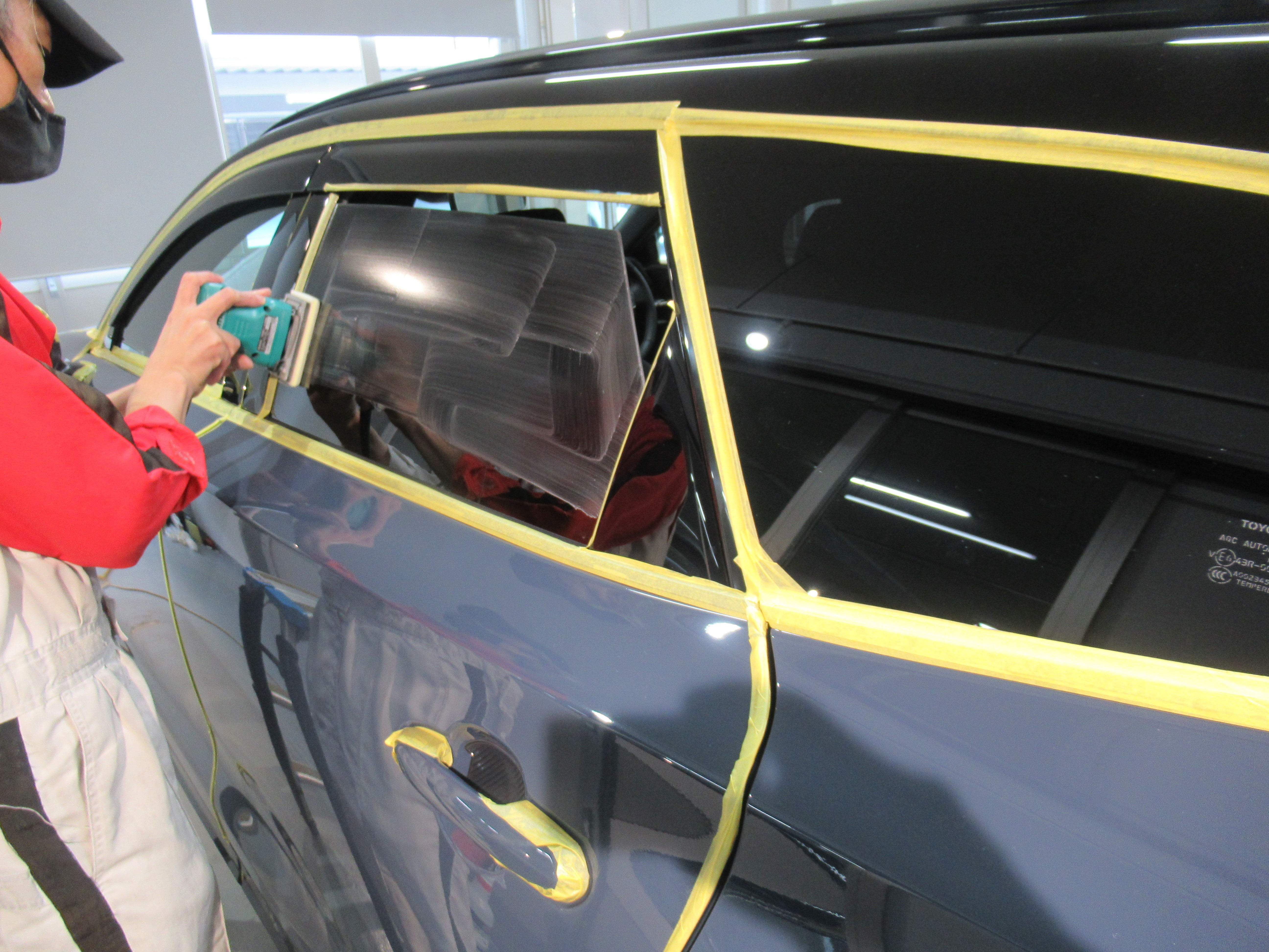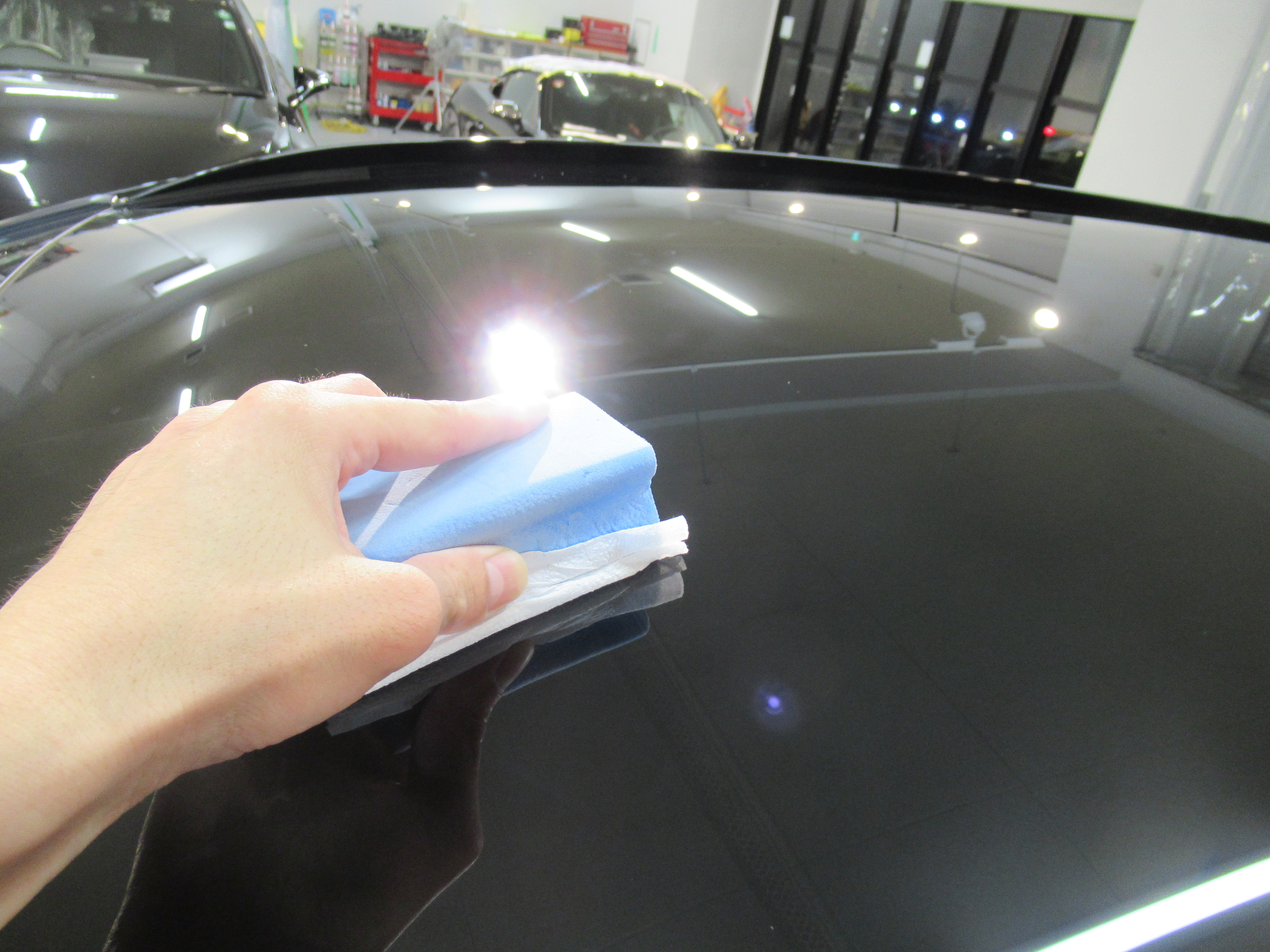 水気をしっかり拭き上げて窓ガラス、サンルーフの油膜除去作業。