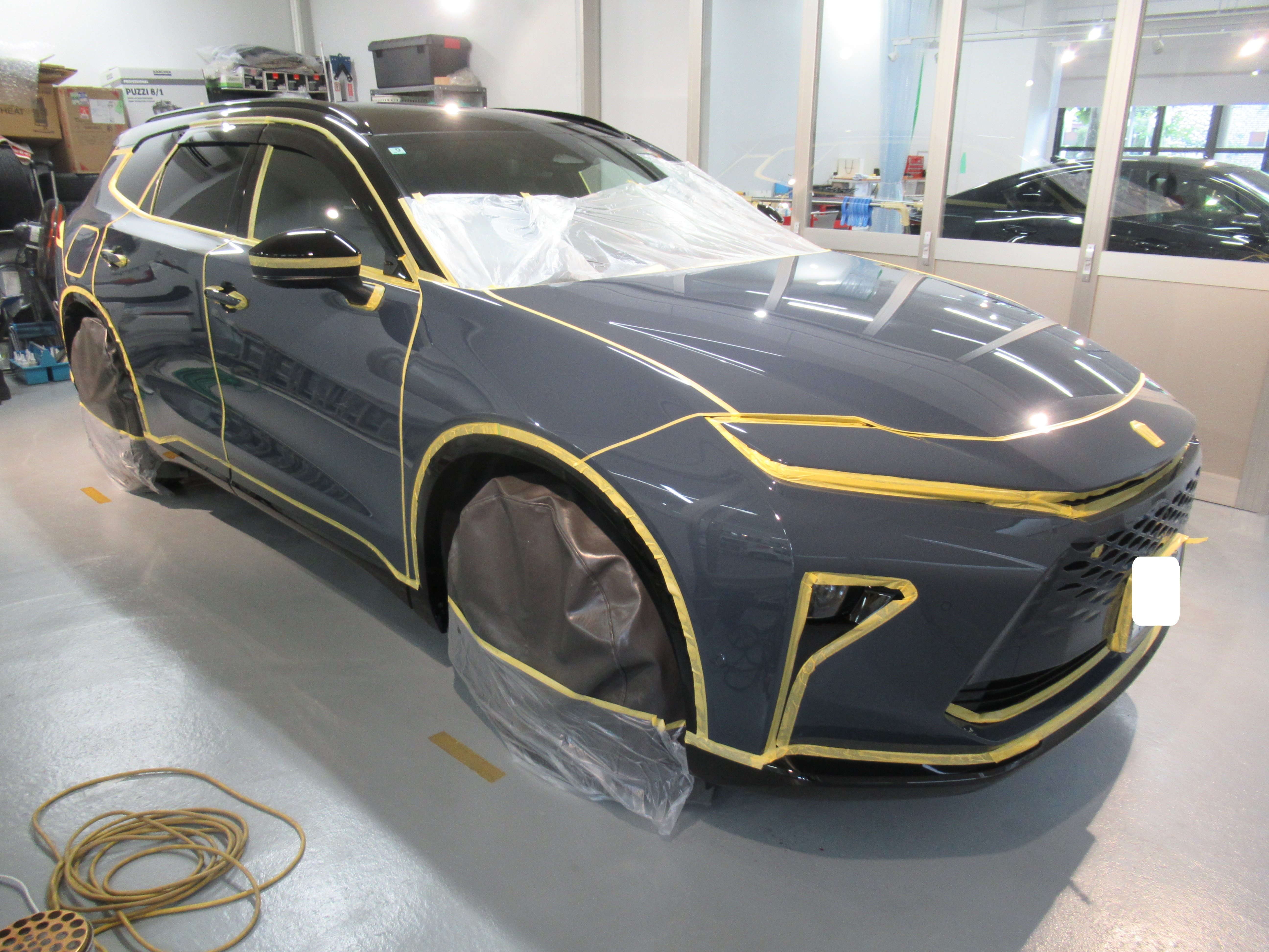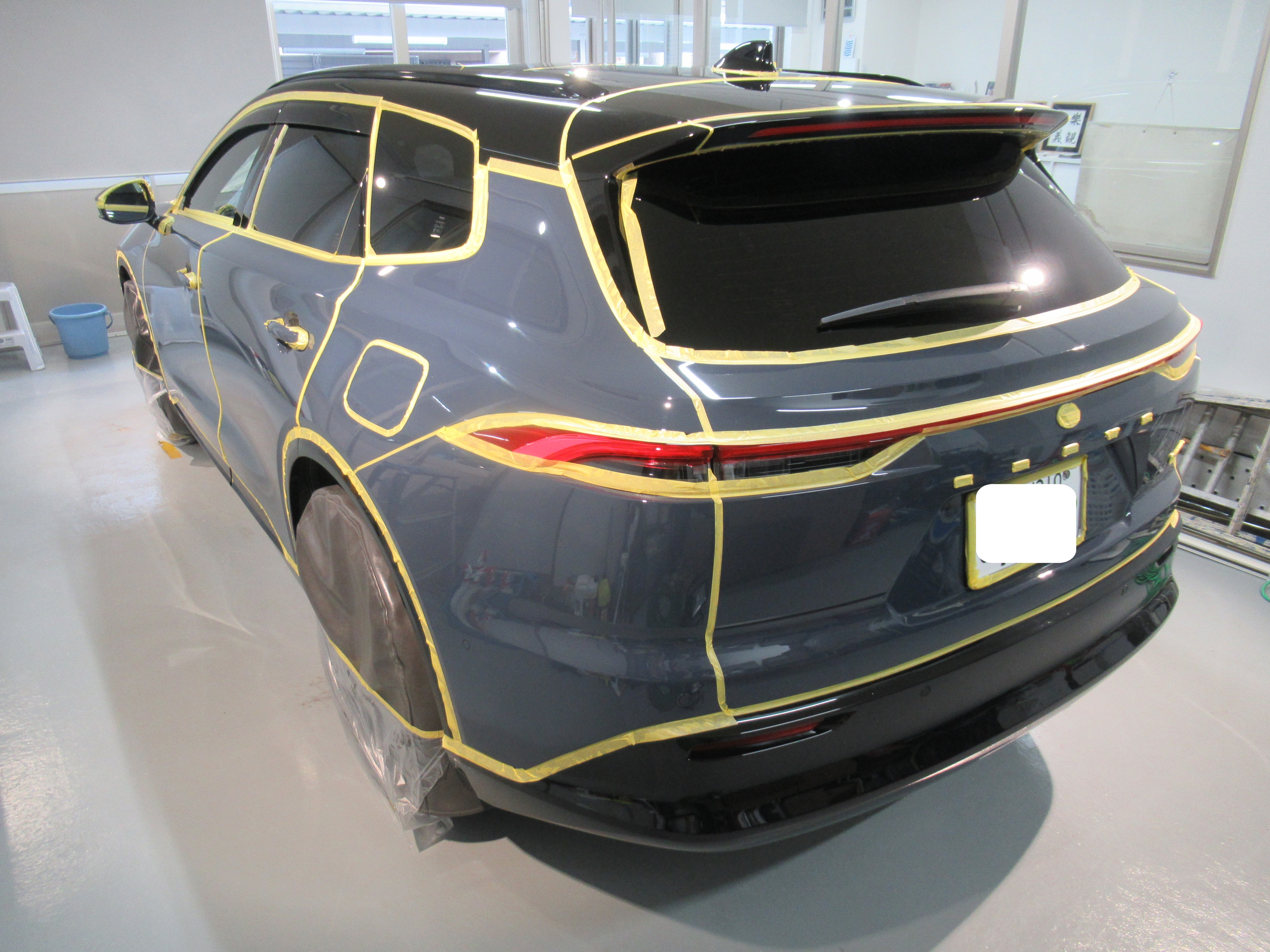 窓ガラス磨きながら、ボディにマスキングしていきます。