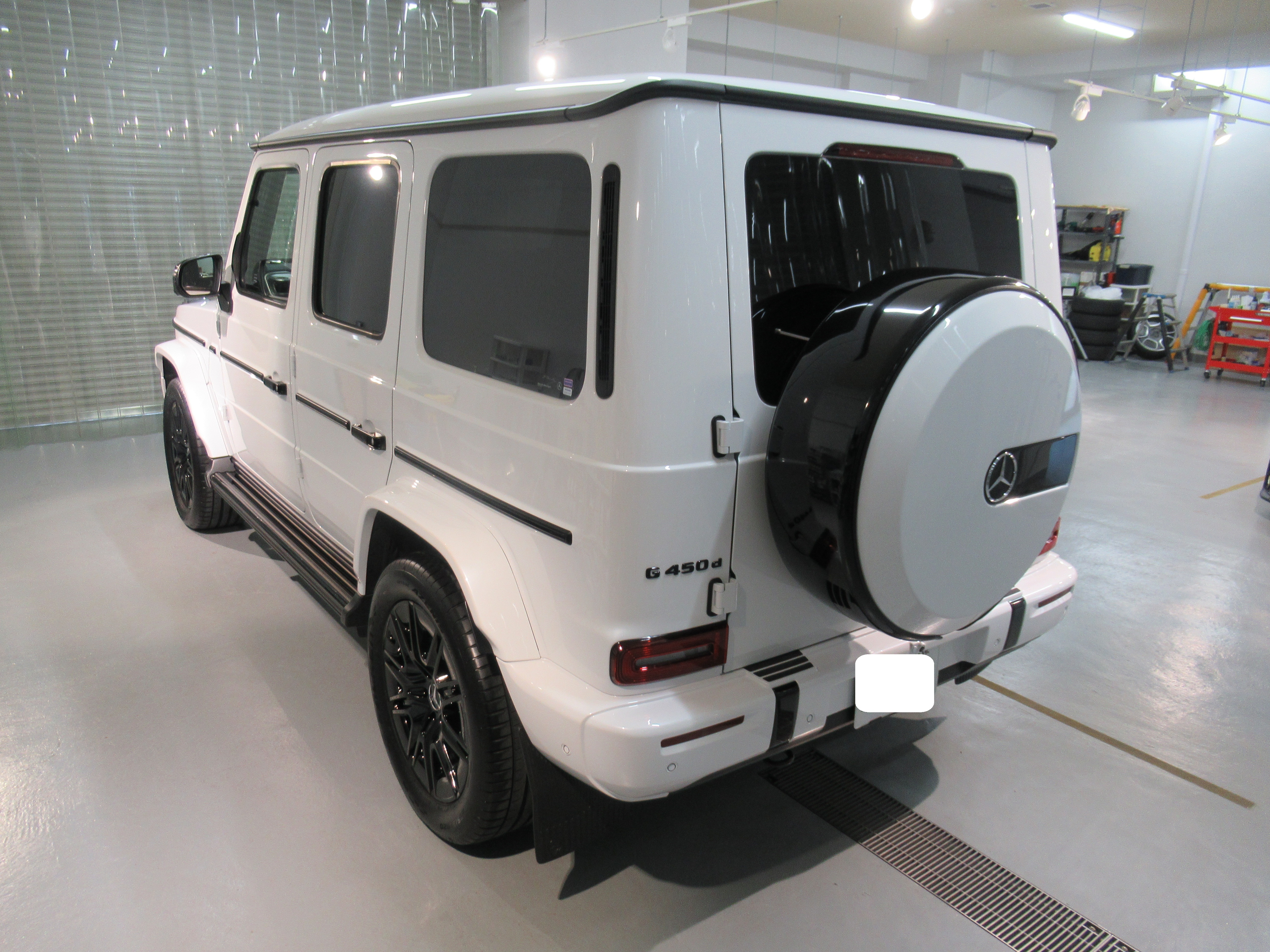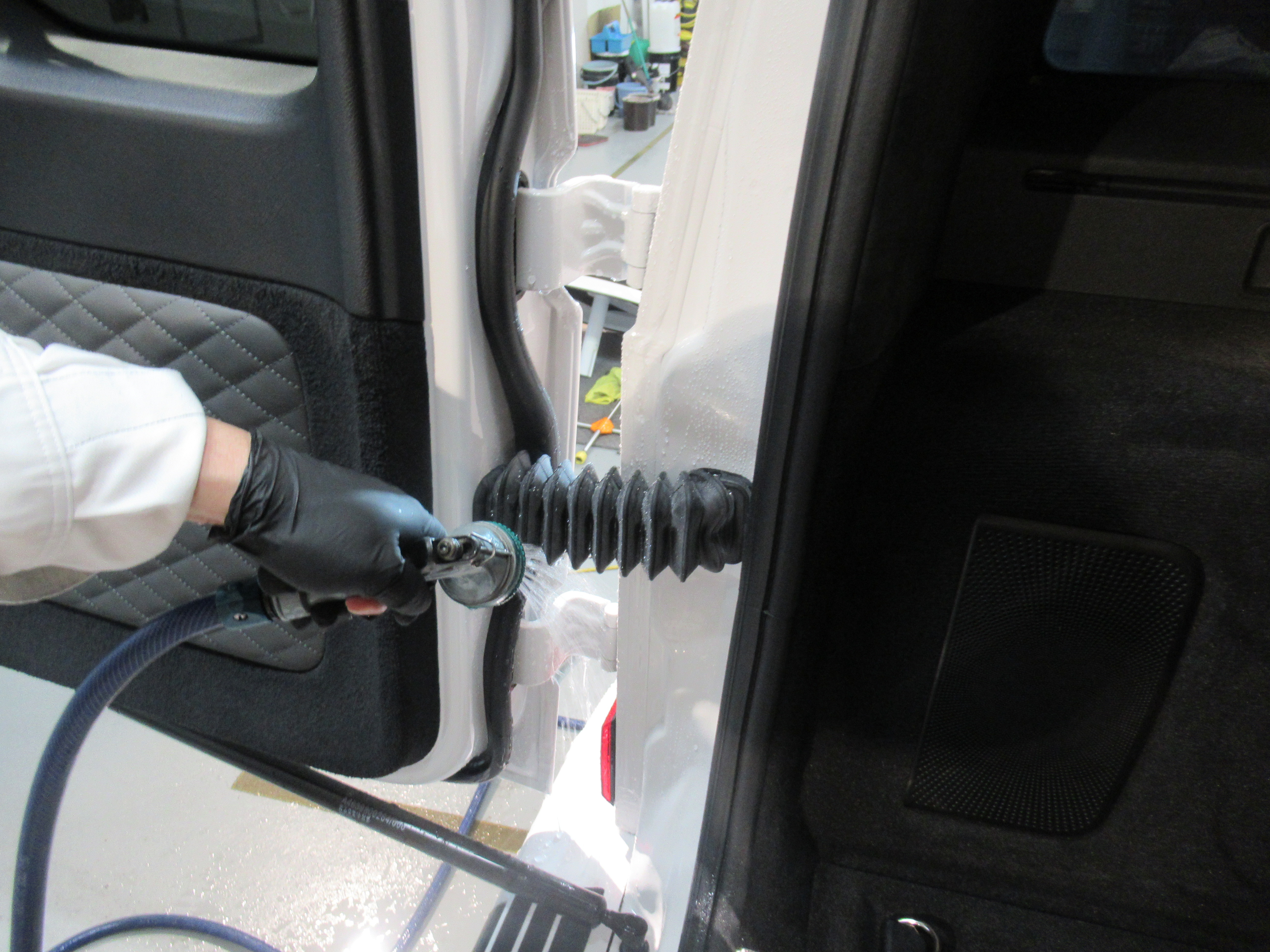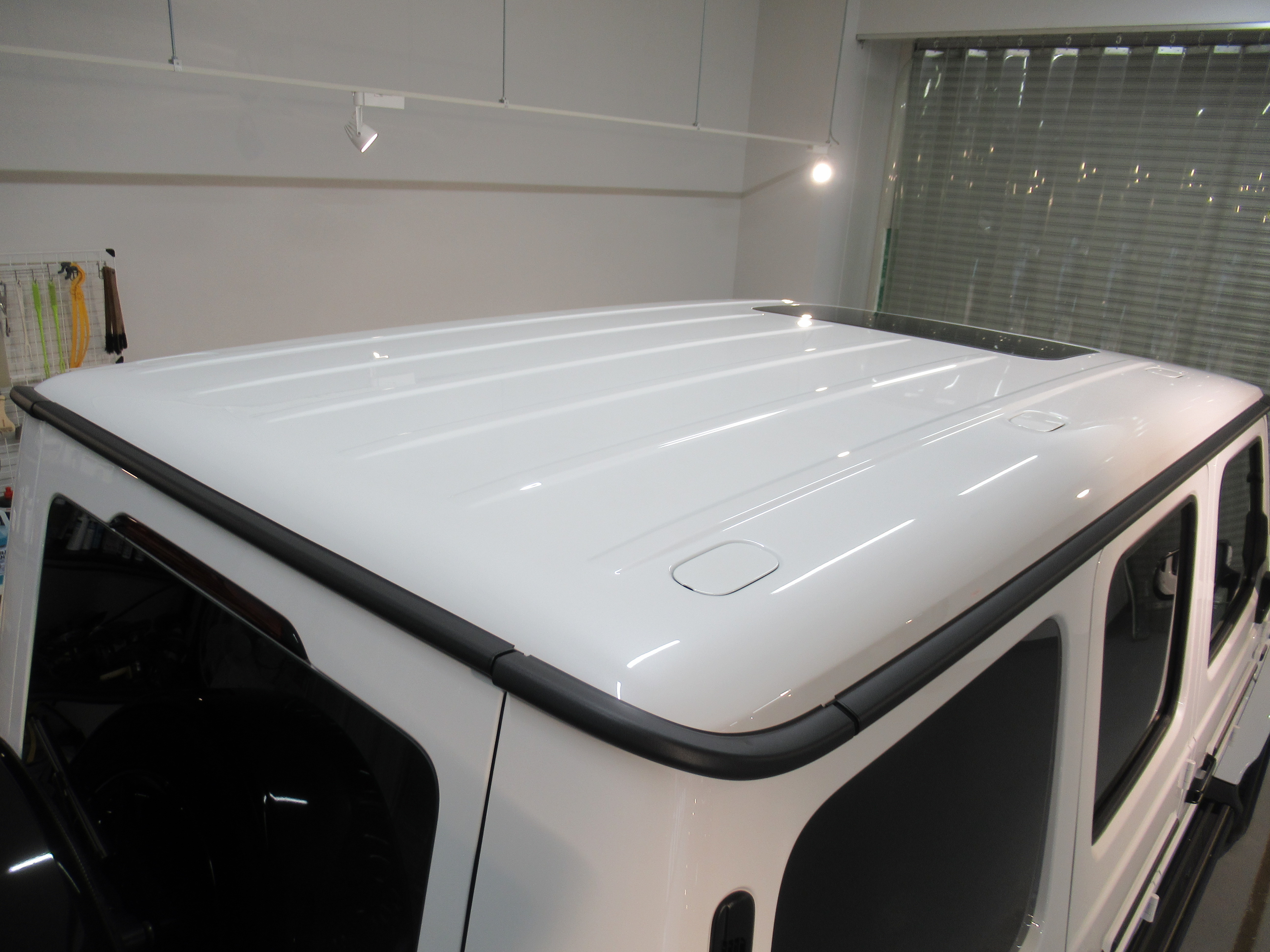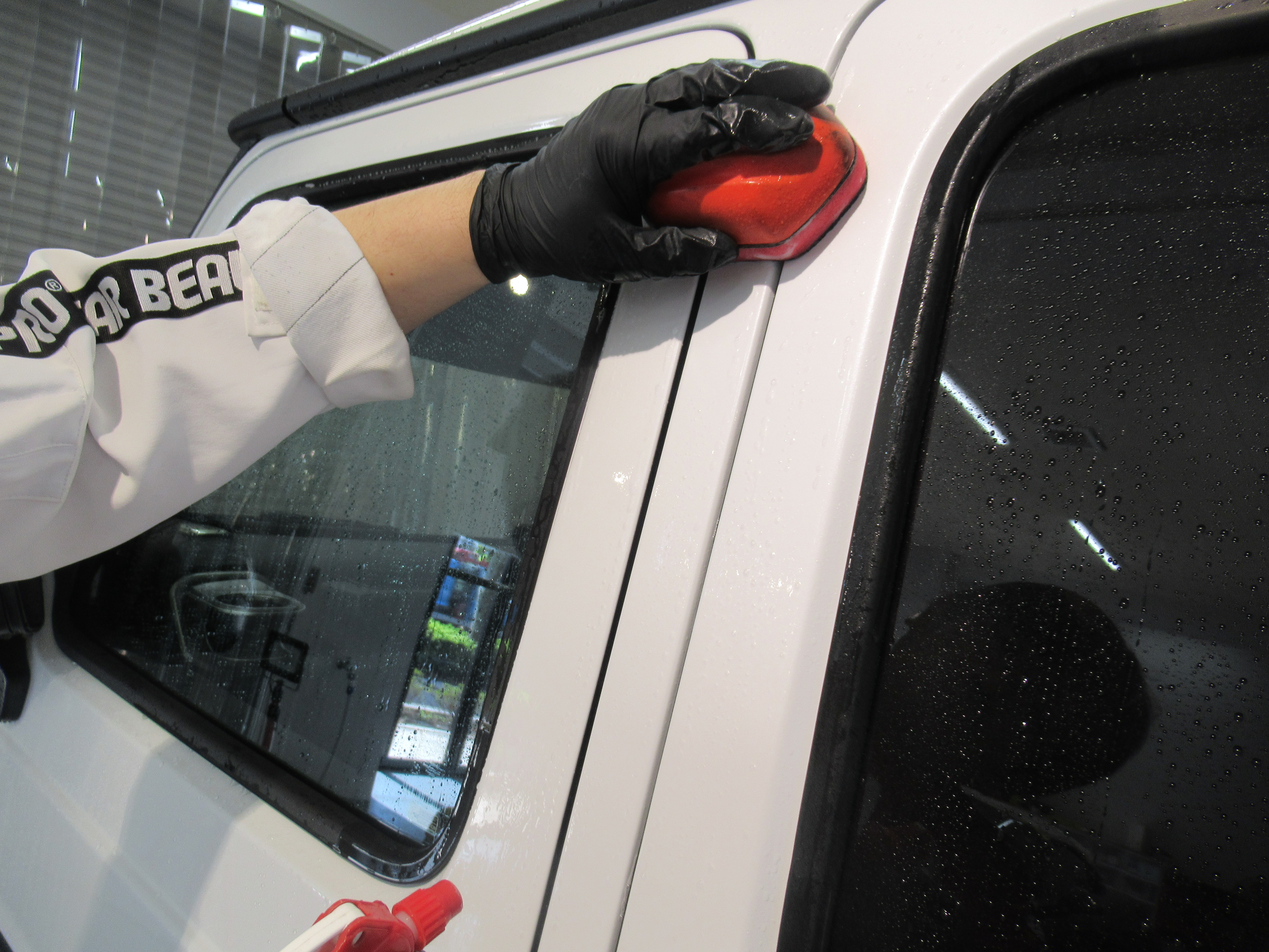 サイド樹脂パーツの中や、ステップ部分、リアスペアタイヤ部分のパーツには特殊素材で加工された部品が取り付けられていたので、違うコーティング剤で対応させていただきました。(撥水ガラスコーティング)