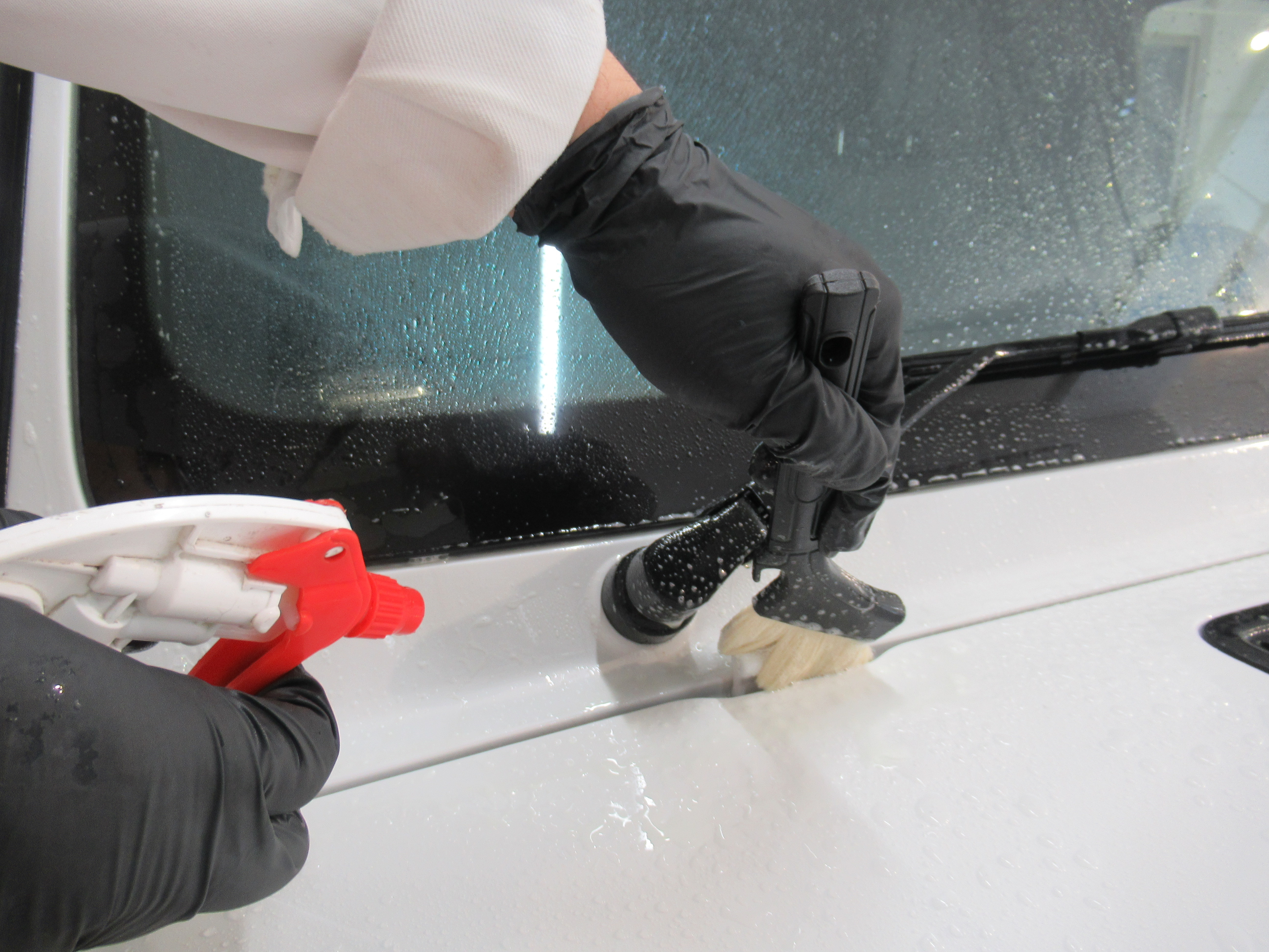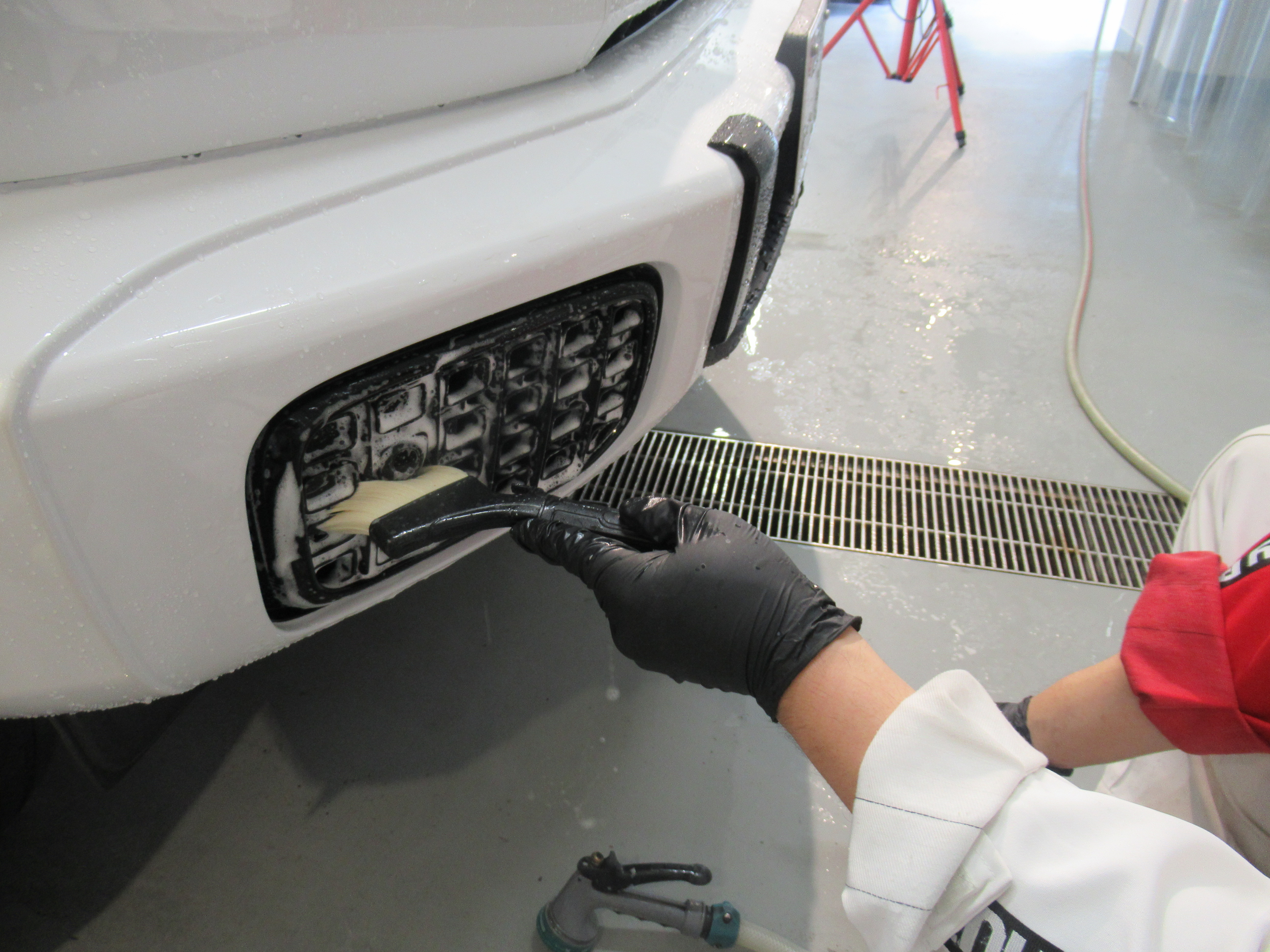 磨きから出るコンパウンドの油分を除去するのと、コンパウンドかすは隙間隙間のどこかしらに侵入しているので一緒に洗浄しながら除去します。