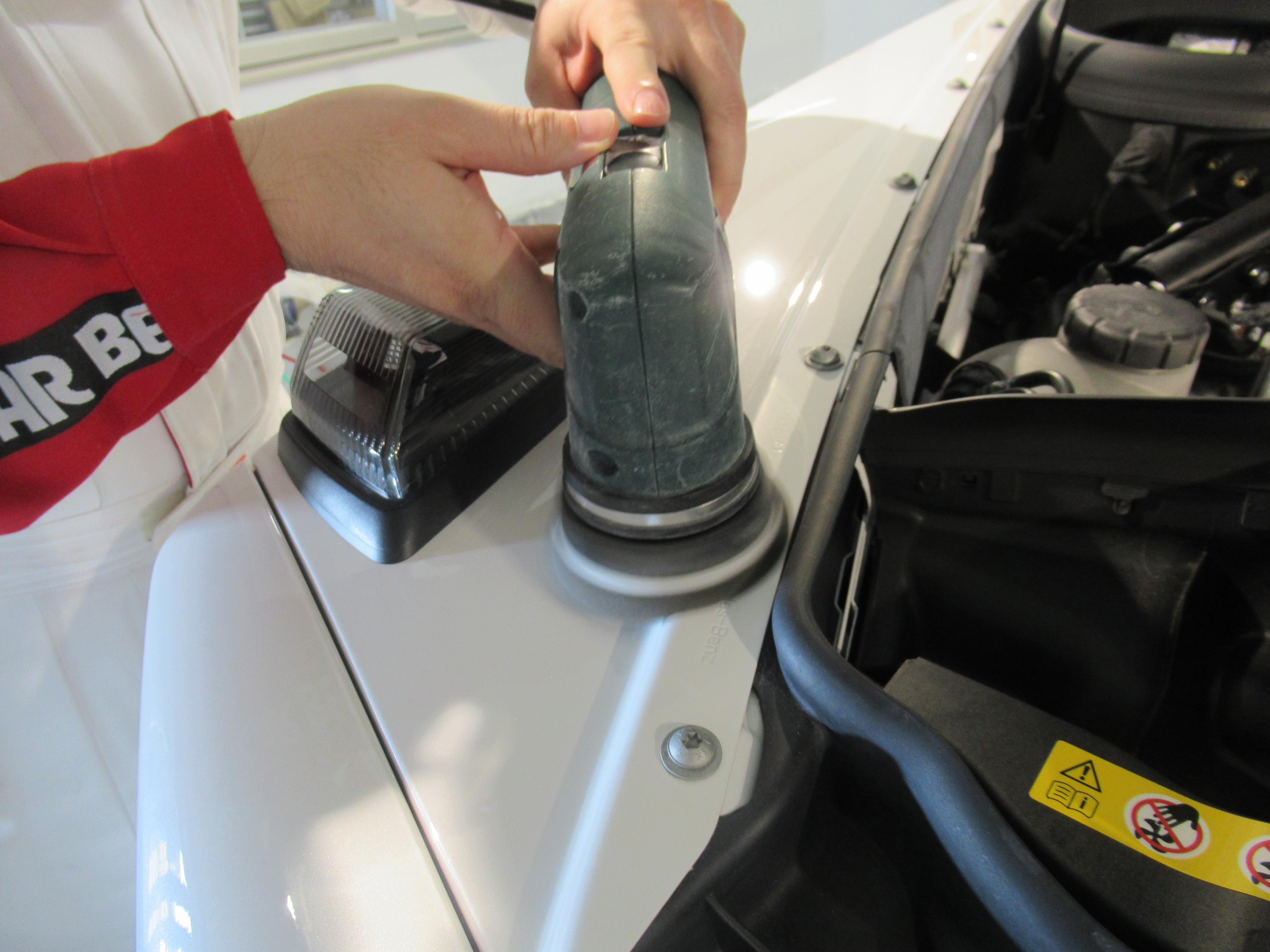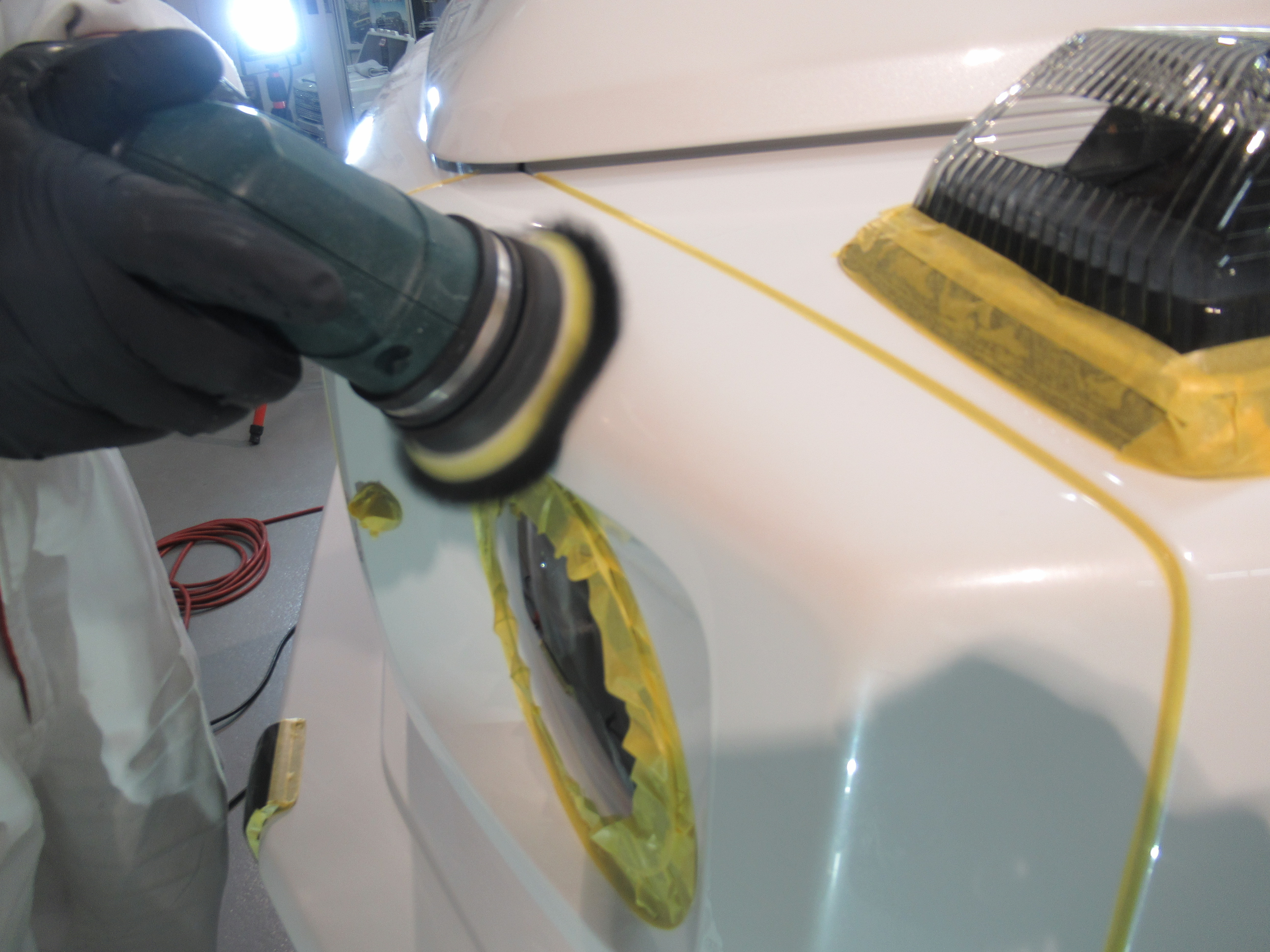 フロント上部の角。樹脂素材に塗装が乗っているので、強い力でみがけないので加減を見ながら磨きます。